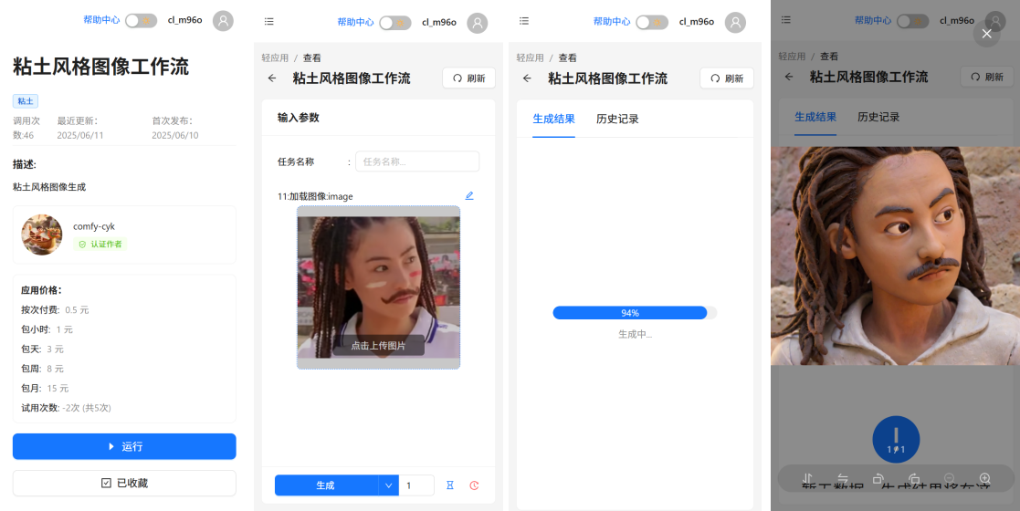 将ComfyUI导出的工作流配置文件(*.json)上传至ComfyLink平台创建的应用中,自定义应用的名称、权限及价格等基础信息,上线后即可顺利获得复制分享链接向用户开放体验。